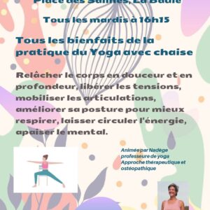 Animé par Nadège, professeure de yoga, approche thérapeutique et ostéopathique. Tous les bienfaits de la pratique du Yoga avec chaise : Relâcher le corps en douceur et en profondeur, libérer les tensions, mobiliser les articulations, améliorer sa posture pour mieux respirer, laisser circuler l’énergie, apaiser le mental.