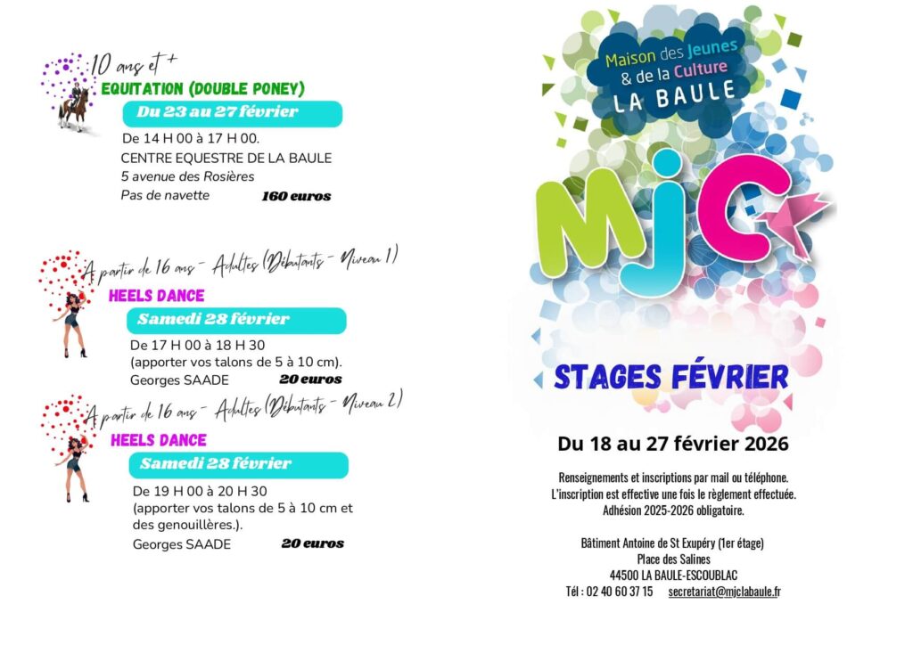 Pour vous inscrire, envoyer un mail à : [email protected] ou tél au 02 40 60 37 15 pour réserver votre place. Ensuite, vous devez remplir une fiche d’inscription 2025-2026 et apporter votre règlement. L’inscription est effective avec le règlement. L’adhésion 2025-2026 est obligatoire.